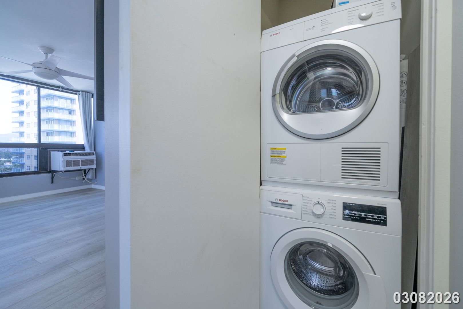 - Updated stainless steel appliances: refrigerator with ice-maker, stove with range, microwave, dishwasher, and stackable washer/dryer